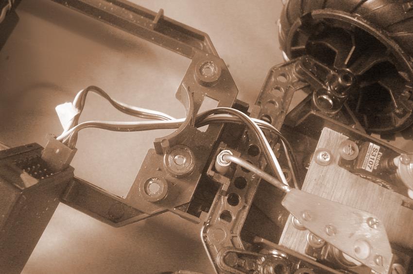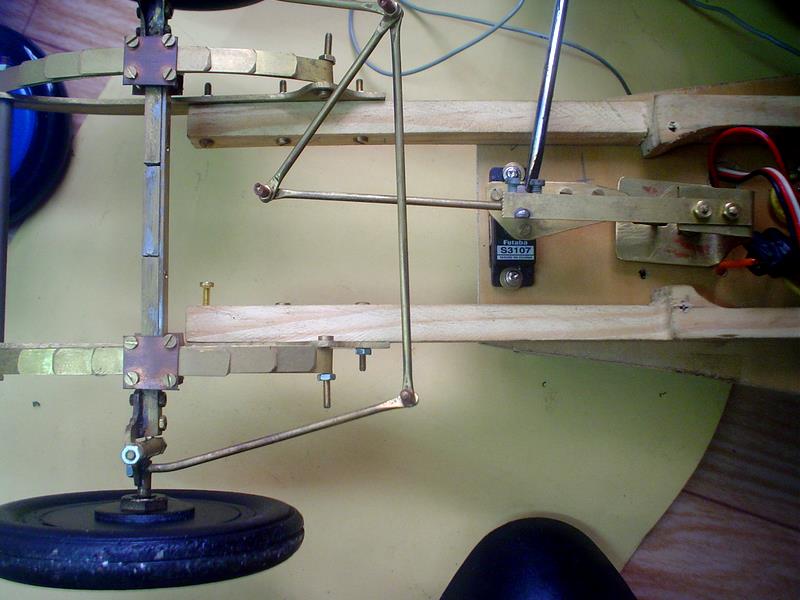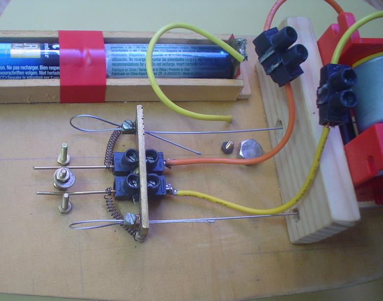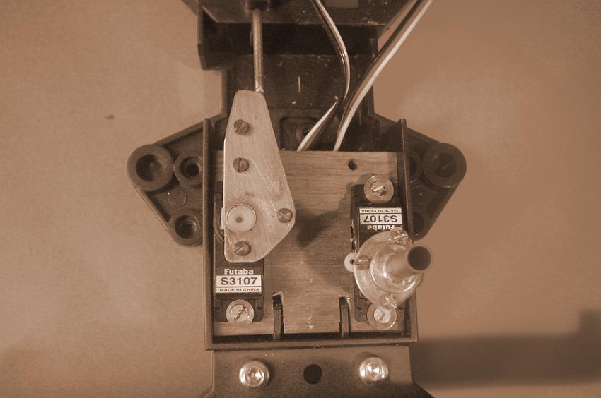Pour cet essai, deux guides en tresse d'acier étaient prévus. Par la suite, une tige de laiton rigide raccordée à un servo sera suffisante. | |