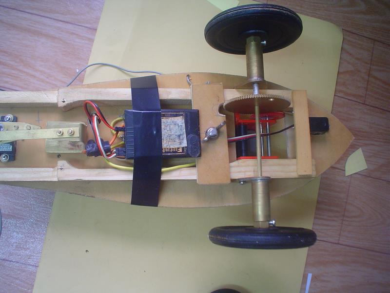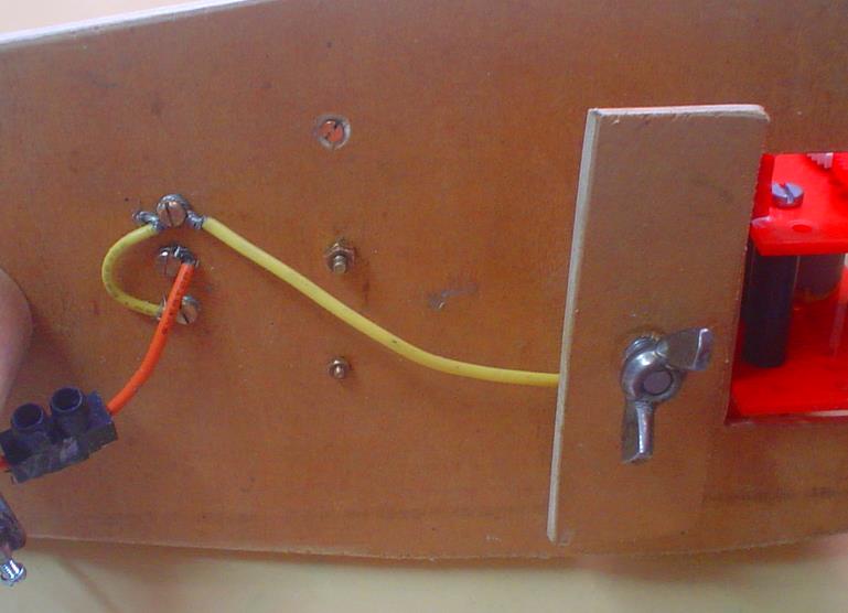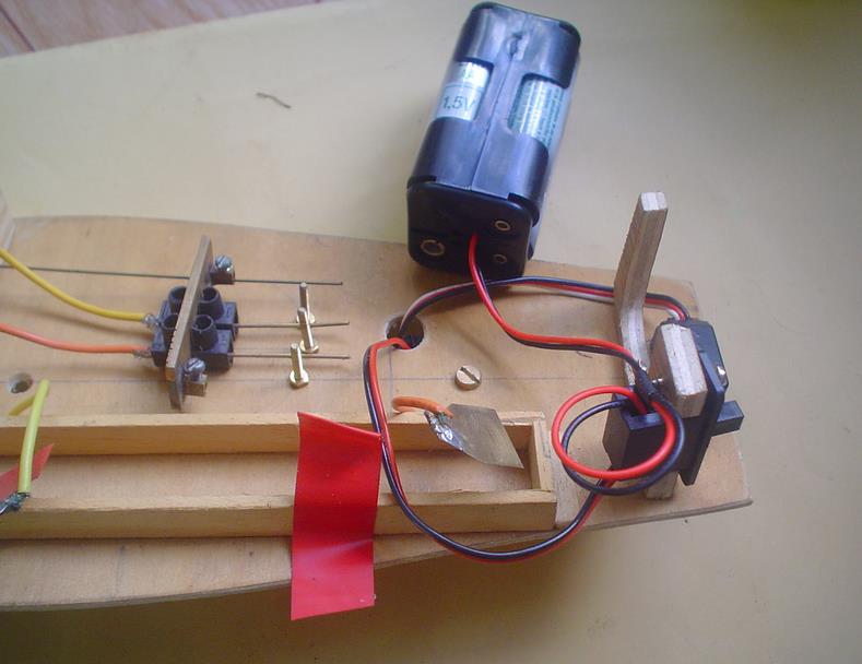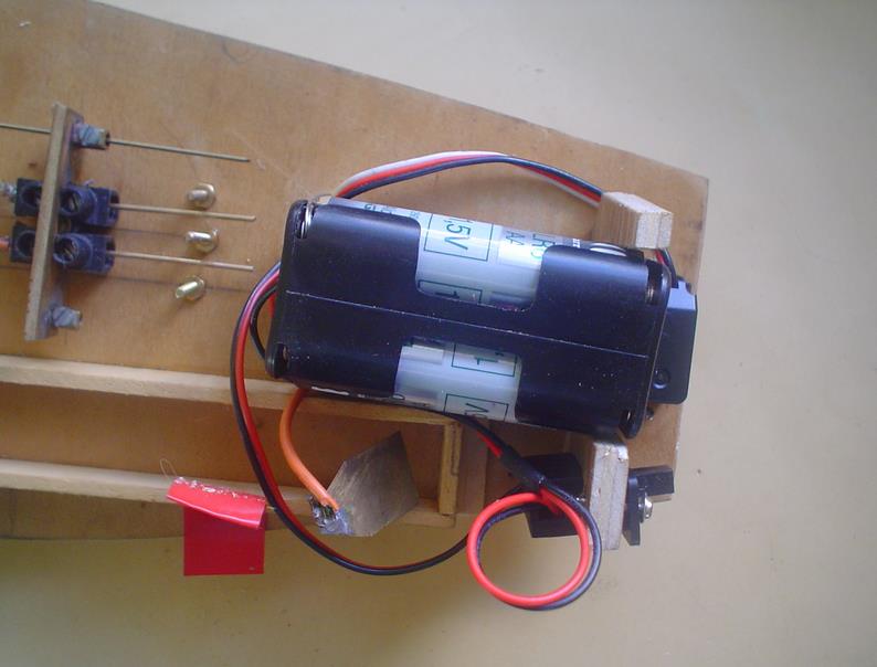 L'alimentation se fait par un pack de 4 piles avec montage de l'interrupteur sur le côté : découpe dans du contreplaqué de 6 pour le maintien (le problème est que les fils des servos ne sont pas bien longs et que je n'ai pas de rallonge ...).