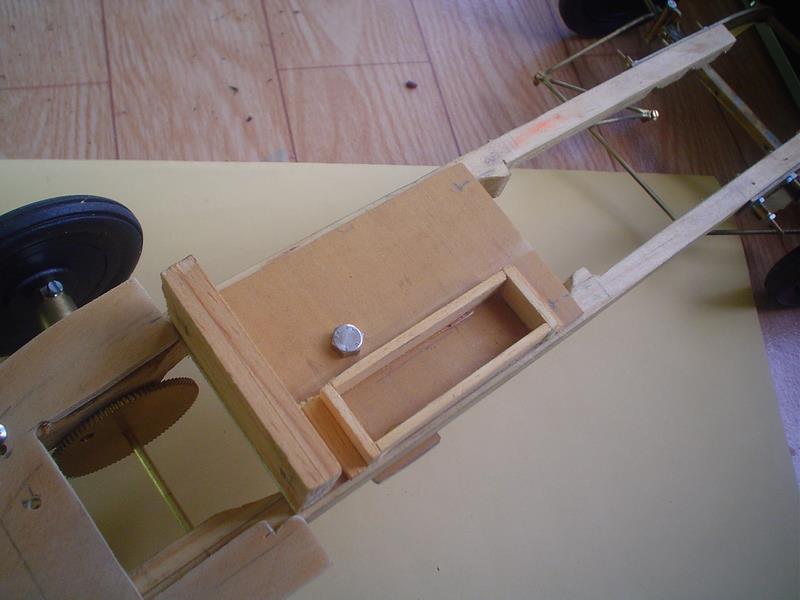 Les photos qui suivent sont celles d'un premier essai. Depuis, la plaque support a été agrandie de même que la latte collée qui sert de support au moteur. |