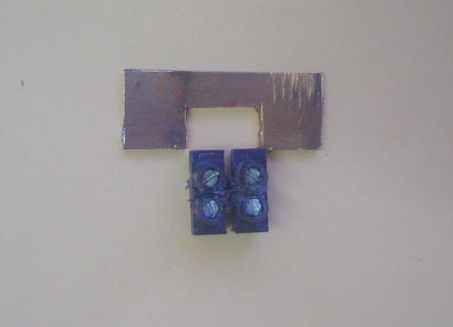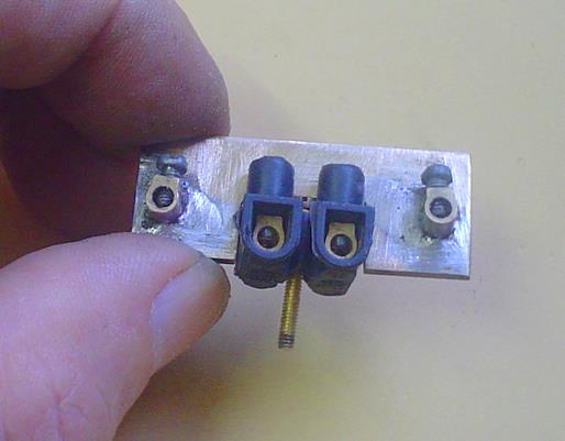 | Vue de dessous : les deux plots extérieurs sont réunis et un fil part vers le +. Le plot central même vers le - . |